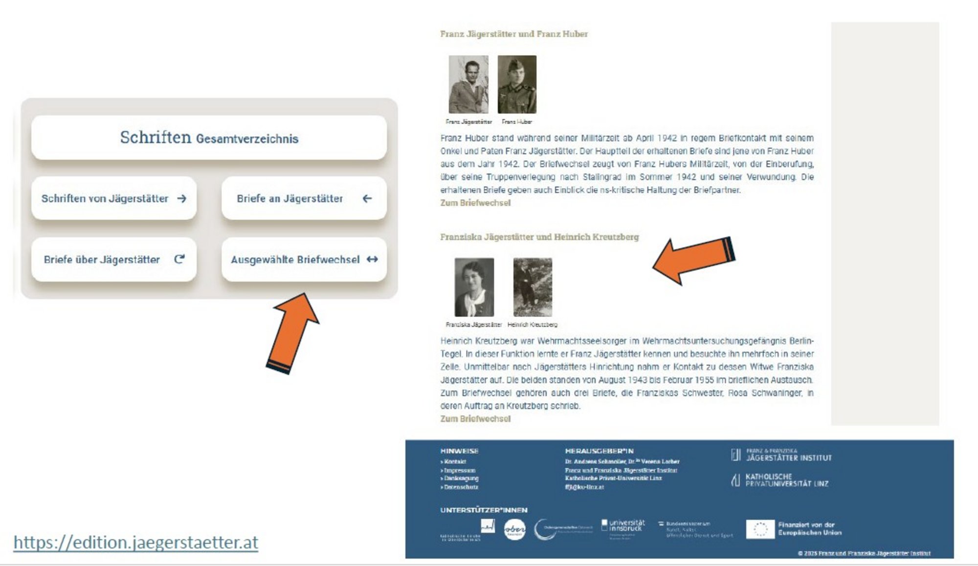 Schließlich die letzte Phase stellte die Integration ausgewählter Fotografien und schriftlicher Quellen in die bestehende Franz und Franziska Jägerstätter-Edition dar. Dazu mussten einige Elemente erweitert und neu gestaltet werden, wie zum Beispiel der Bereich Fotos und Dokumente oder der Menüpunkt Korrespondenzbeziehungen.