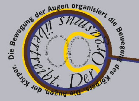 Die Blätter an den Wänden und die Buch-Objekte in den Vitrinen sind in ein breites Spektrum von Text-Bild-Dialogen der Gegenwart und der Geschichte eingebunden - und nehmen Bezüge zu dieser Tradition etwa in Form der Embleme auf. Das Wechselspiel von Bild, Schrift und Schriftbild lässt sowohl die Differenzen der Medien als auch ihre Verwandtschaft hervortreten. Gsaller stellt somit in "AUGE oder EI" die ältesten Gegensätze alphabetischer Kultur zwischen Zeigen und Nennen, Abbilden und Sagen zur Diskussion.