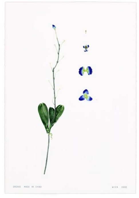 Die Blätter wirken wie Aquarelle aus einem Botanik-Buch des 19. Jahrhunderts. Erst auf den zweiten Blick erkennt man, dass es sich bei den Studienobjekten um zerlegbare Seiden- oder Plastikblumen handelt - "Made in China", wie der ins Blatt geschriebene Titel verrät.