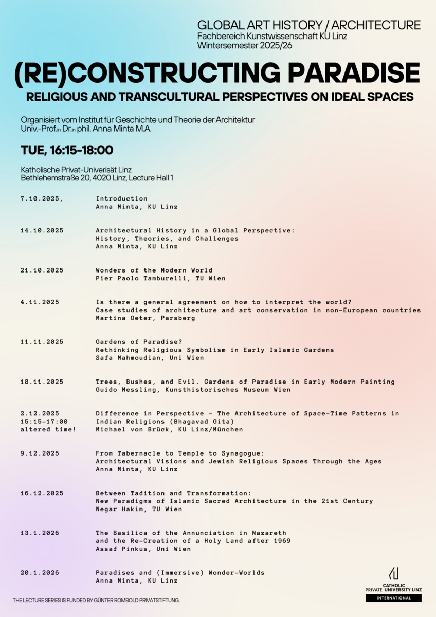 "(Re)Constructing Paradise: Religious and Transcultural Perspectives on Ideal Spaces". Öffentliche Vortragsreihe im Rahmen der Vorlesung "Global Art History / Architecture" von Professorin Anna Minta (Institut für Geschichte und Theorie der Architektur) im Wintersemester 2025/26. Die jeweils dienstags stattfindende Veranstaltung wird in englischer Sprache abgehalten!