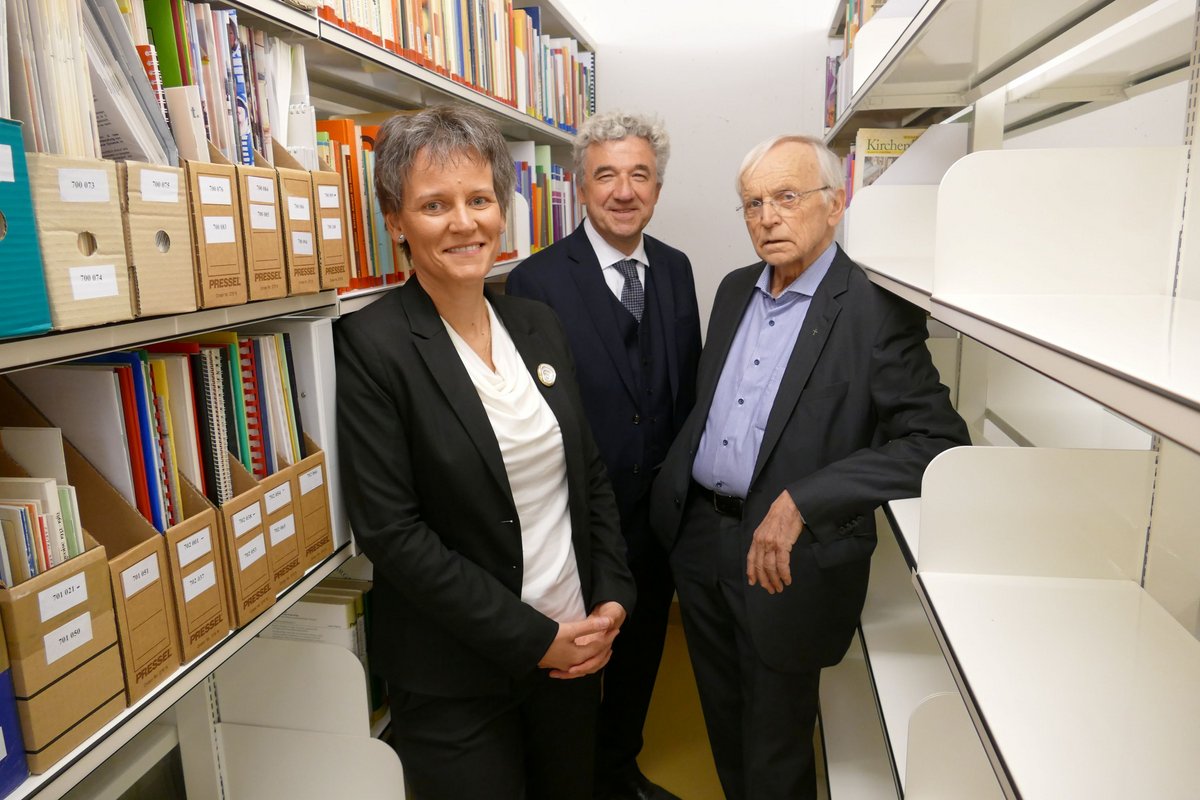 Wie eine solche Erkundung und wissenschaftliche Erschließung der umfangreichen Sammlung – es handelt sich um 777 Monographien, 666 Zeitschriften- und Zeitungshefte und rund 320 Film- und Tondokumente – möglich wird, stellte Bibliothekdirektor Ingo Glückler vor. Seine Darlegung der Schritte, wie ein Bestand von Dokumenten zu einem analog und digital zugänglichen, recherchierbaren und langfristig gesicherten Archiv wird, war eine Einführung in den informationstechnologischen ‚State of the Art‘ und zugleich Zeugnis der selbstgesetzten Aufgabe: Das Ziel sei, so Glückler, ein „lebendiges Archiv, das wirkt, ein offener, einladender Ort des Denkens, der Auseinandersetzung und des Dialogs“.
