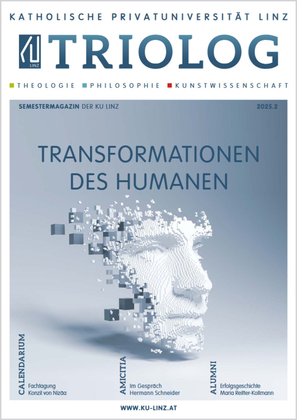 Seit Wintersemester 2013/14 erscheint zwei Mal jährlich – jeweils im Mai und im November – das Semestermagazin der KU Linz. Es gibt Einblicke in Veranstaltungen und Projekte, in Forschung und Lehre sowie weitere Themen und Aktivitäten der Universität. Die Bezeichnung TRIOLOG lenkt den Blick auf die drei Säulen der Katholischen Privat-Universität Linz – die Fachbereiche Theologie, Philosophie und Kunstwissenschaft.